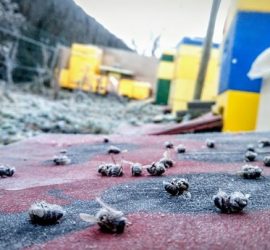 Dit ziet er misschien verontrustend uit, maar het is eigenlijk een goed teken: elke dag sterven er sowieso een aantal bijen maar het volk is sterk genoeg om ze ondanks de koude toch buiten te zetten, een teken van vitaliteit dus!