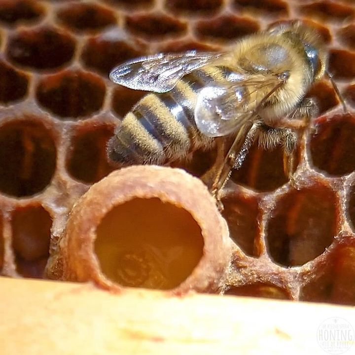 ’t Zijn tijden van overvloed nu voor de bijen en dus maken ze de eerste zwermplannen: nieuwe koninginnen zijn in de maak (je ziet op de foto een moerdop met een prinsessenlarfje badend in de koninginnenbrij) en binnen een weekje zou de oude koningin samen met de helft van het volk vertrekken naar andere oorden, een onzekere toekomst tegemoet en het restvolk achterlatend met een schat aan voedsel en broed. Maar tussen droom en daad staan imkers met praktische bezwaren…