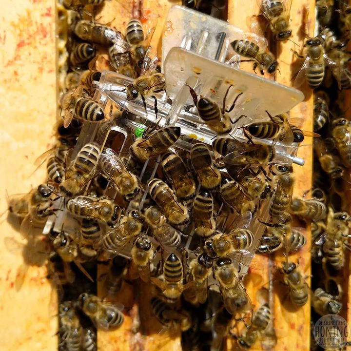 Koninginnen geven onweerstaanbare feromonen af, dus als we hare majesteit even in een kooitje aan de kant leggen bij het werken in de kasten, wordt ze in no time overspoeld door de bijen.
