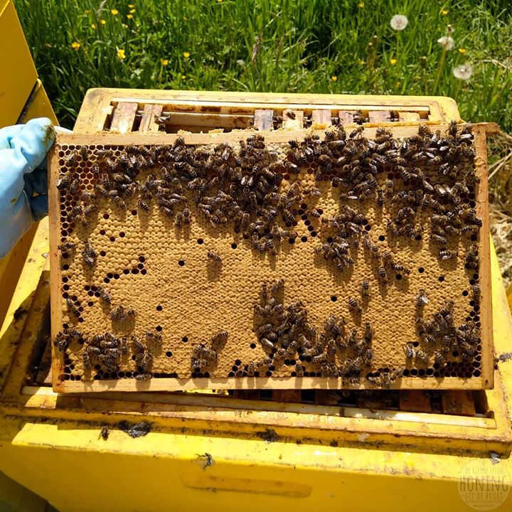 Waarom bijenkoninginnen supermoeders zijn: Je ziet op deze foto zo’n 2500 gesloten broedcellen. De koninginmoeder krijgt dat in deze periode vlotjes voor elkaar op 2 dagen! Als ze geen enkele pauze neemt, dan is dat ongeveer één (1!) minuut om een cel te inspecteren, het achterlijf er in te manoeuvreren, een eitje te bevruchten met het zaad van de darren dat ze bewaart in haar spermatheek, het eitje op de bodem van de cel te leggen en er terug uit te komen. Dat zo’n 1500 keer per dag dus, en élke dag. 😯