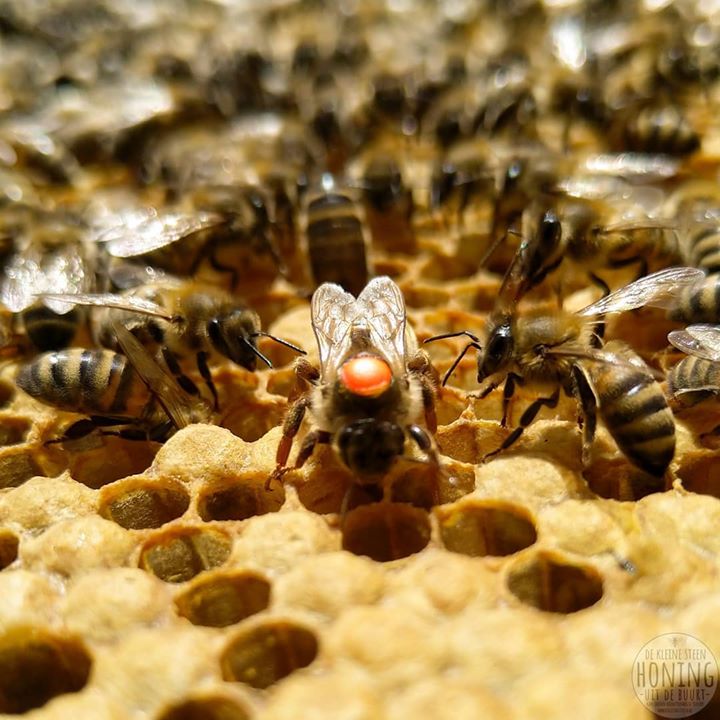 Deze koningin is de oudste van onze imkerij: ze is 2 jaar oud en doet het nog prima. Onze andere moeren zijn allen van 2019 of 2020.