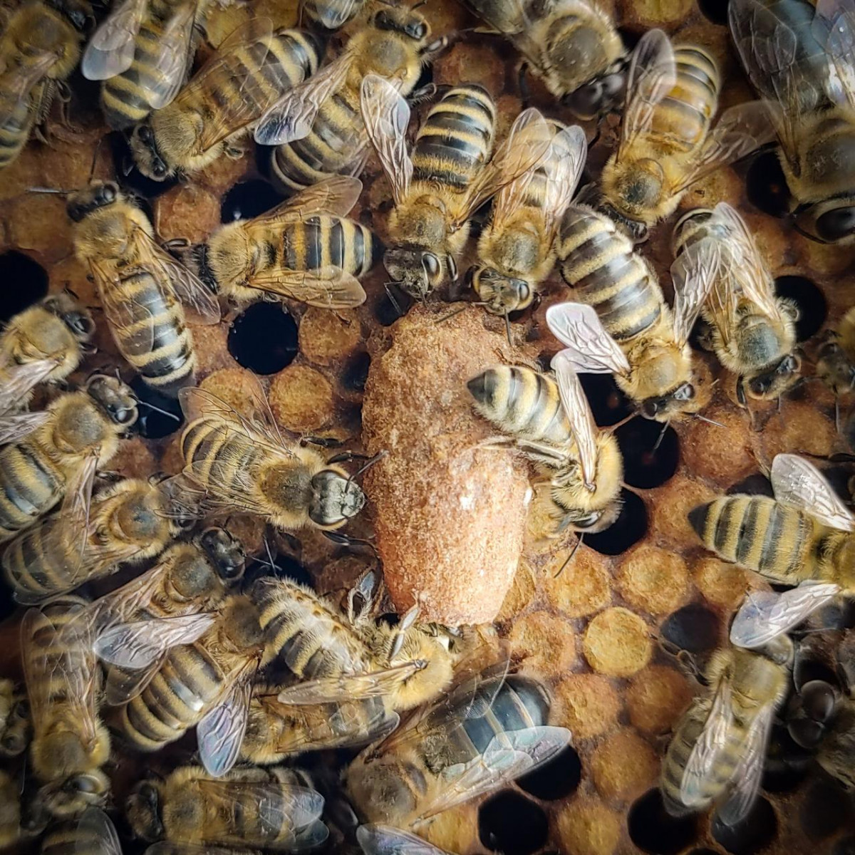 Dit is er eentje van de laatste soort: de bijen voelen aan dat hun moer op haar retour is en bereiden nu haar opvolging voor. Als dat goed gaat en de nieuwe moer uiteindelijk succesvol aan de leg blijkt te zijn, zijn de dagen van de oude geteld en zal ze door haar dochter afgestoken worden, of door de werksters ‘ingebald’ worden, een soort van dodelijke groepsknuffel…