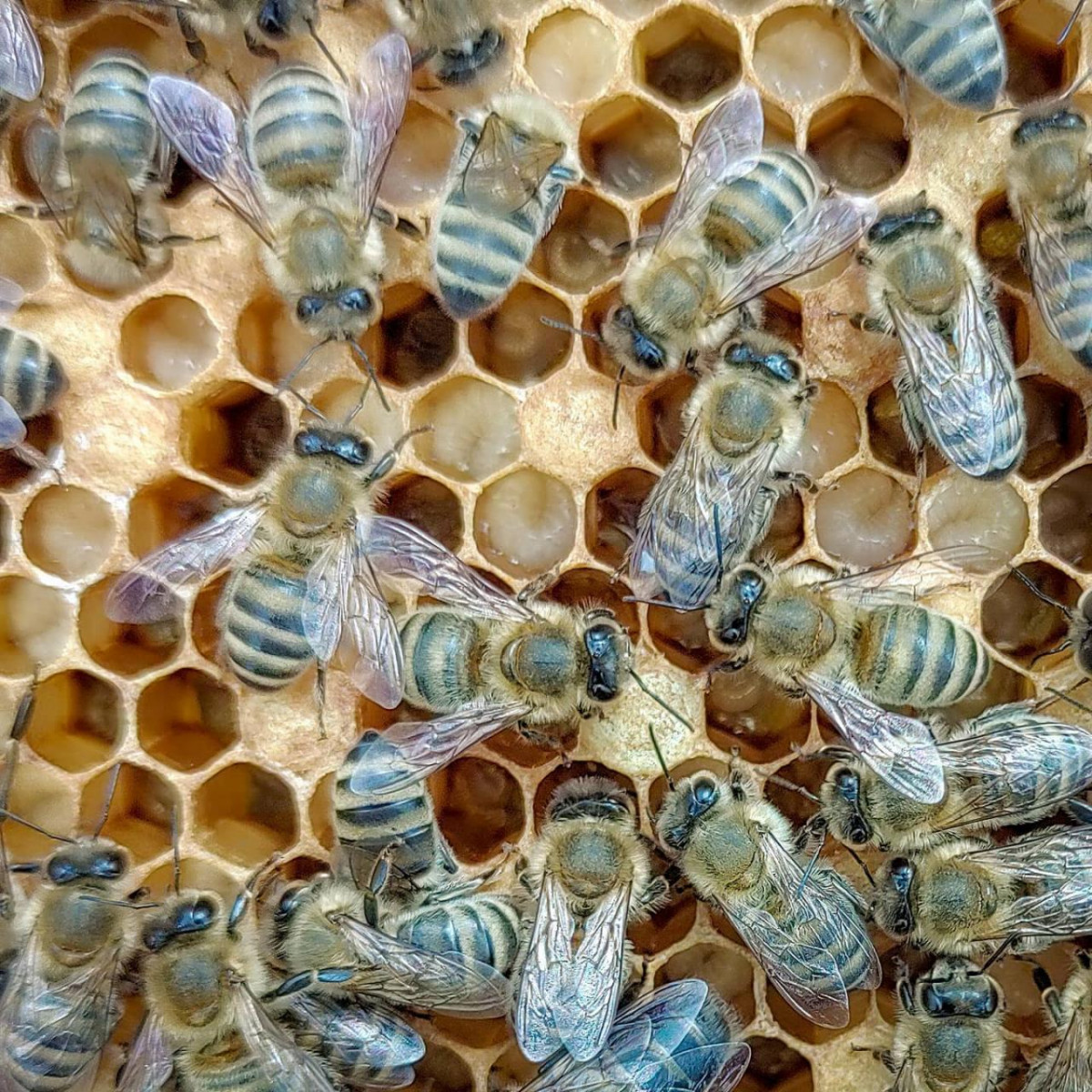 eerst 3 dagen eitje (niet op de foto), daarna 6 dagen larve (of ‘open broed’, waar de werksters voor zorgen) en dan 12 dagen pop (‘gesloten broed’) en tenslotte het ‘imago’ of de bij zoals we haar kennen.