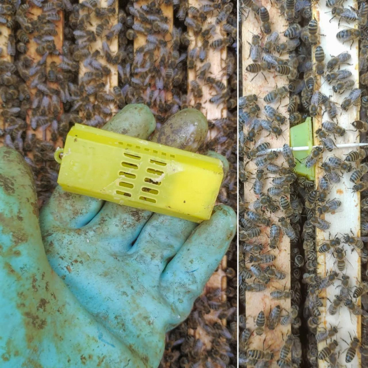 Grote werken op de imkerij: op de productiekasten is al het broed verwijderd en naar een andere stand gebracht om op te groeien tot reservevolkjes. Zo reduceren we de varroa-parasiet in de productievolken al met 80%. De voedsterbijen van die volken zijn nu werkloos en promoveren tot haalbijen. Nog een laatste tandje bijzetten dus voor de zomerhoning, die normaal gezien beschikbaar zal zijn vanaf 16 juli. Een aantal volken kreeg ook al een nieuwe koningin, die we invoeren met een kooitje met een suikerstop. Zo geven we het volk en de nieuwe koningin even tijd om aan elkaar te wennen tot de suikerstop weggegeten is. En bovendien: wie zoet meebrengt als ie in een nieuwe groep terechtkomt, wordt altijd extra vriendelijk ontvangen, niet?