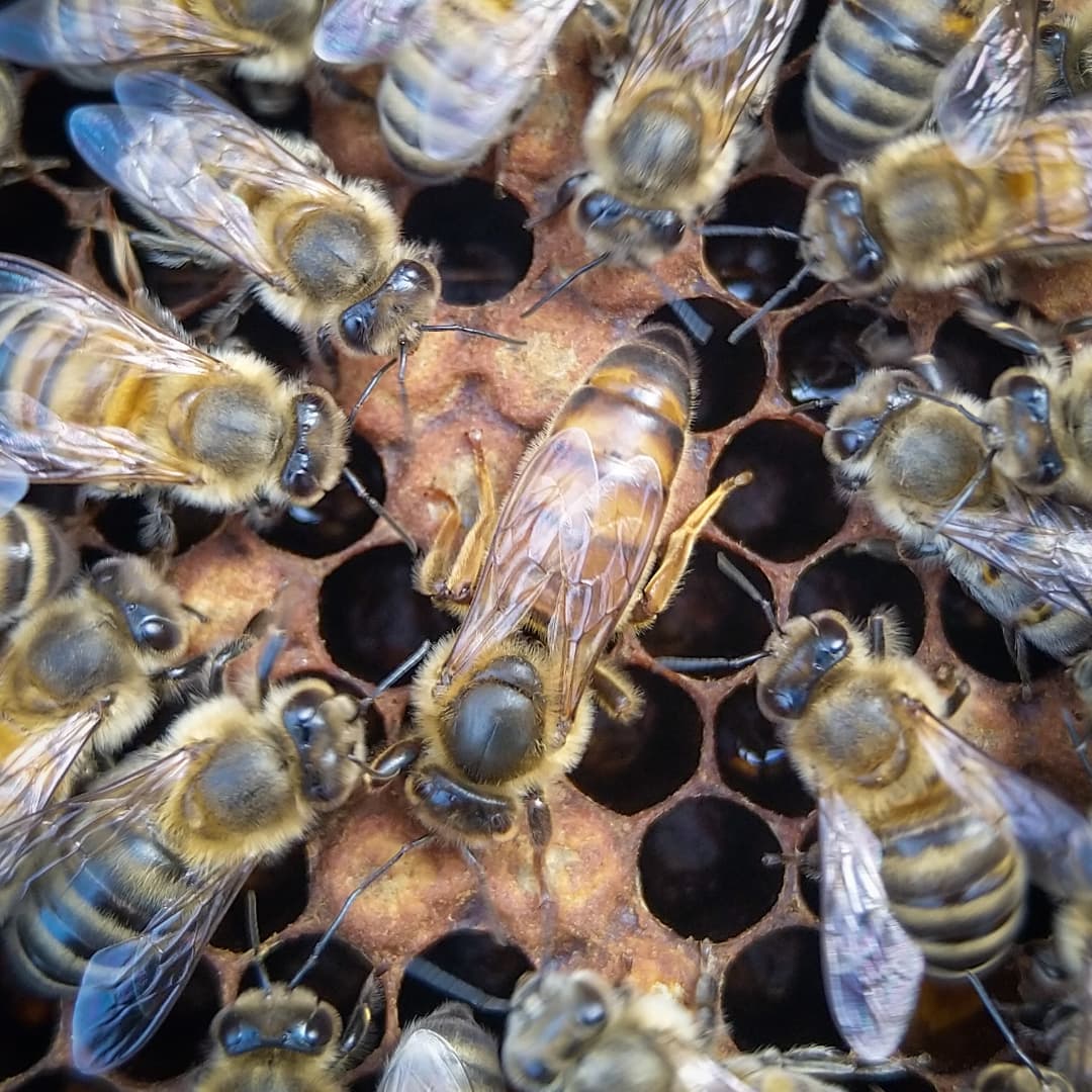 Hier een foto van de jongste koningin van onze bijenstand. De bijen van dit volk hebben zelf – laat op het seizoen – hun oude moer vervangen door een nieuw exemplaar en dat vinden wij prima. Momenteel het sterkste volk van al.