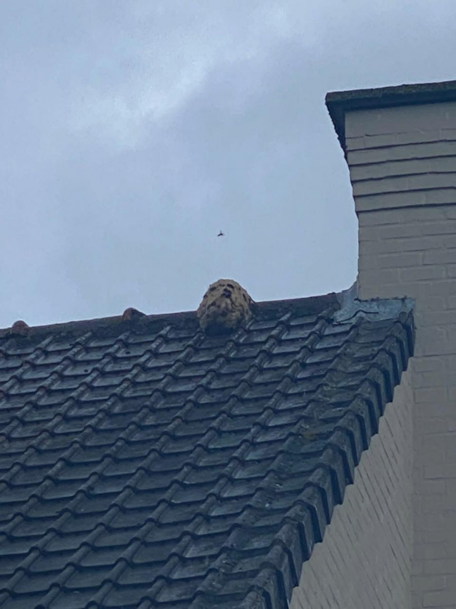 In Mere een heel vreemd nest: onder de nokpan en het is er aan beide kanten van de nok uitgegroeid. De bewoners waren lange tijd op reis geweest en troffen dit bij terugkomst aan.