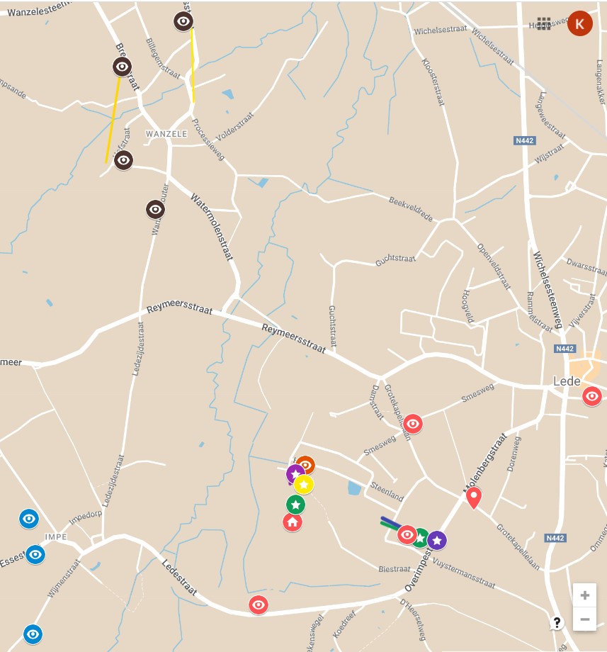 De oogjes zijn waarnemingen van individuen. De sterren zijn wiekpotten van mij. en het rode huisjes is de locatie van het nest. Detailkaartje in één van de volgende foto’s.