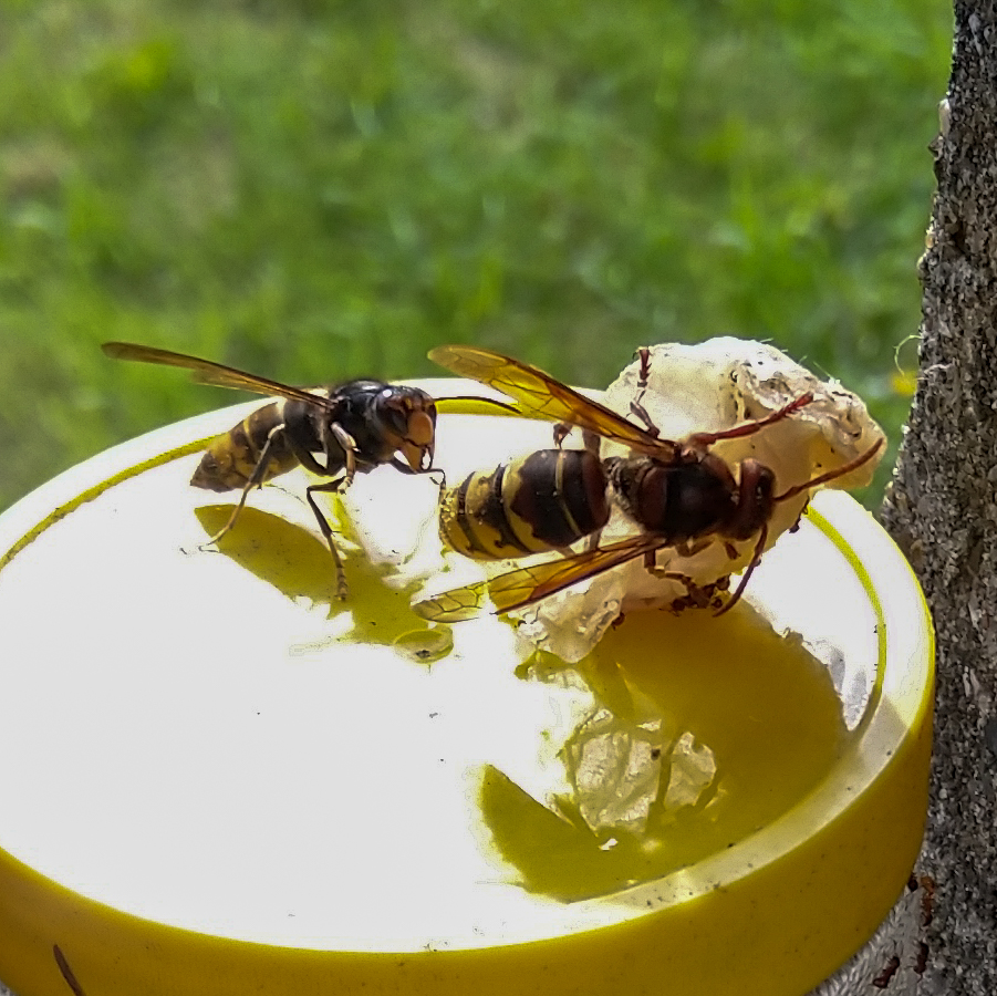 Zeldzame observatie van een Aziatische (links) én een Europese hoornaar (rechts) op één pot. Normaal gezien duldt de grotere Europese geen andere dieren op de pot.