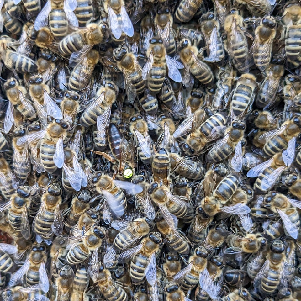 Af en toe scheppen we wel eens zwermen, en die zijn dan dus van andere imkers en de koninginnen daarvan zijn eigenlijk nooit gemerkt. Wat een heerlijkheid om dus eens een eigen zwerm te kunnen scheppen en de koningin makkelijk te vinden! Hoewel zwermende koninginnen flink hun best doen om zich onder de andere bijen te positioneren, kon ik deze dankzij haar gele sticker snel vinden 🙂